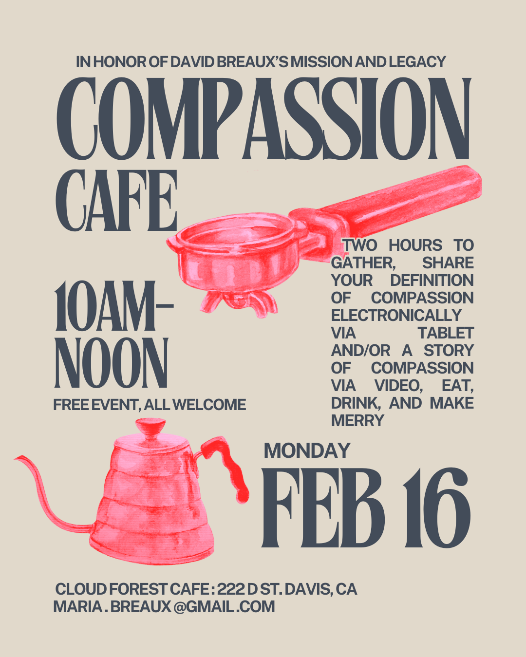 My brother David's purpose was to raise awareness of compassion. He had big plans, some realized and others envisioned: tens of thousands of definitions of the word compassion in a notebook, the Compassion Corner Earthbench, the Compassion Tour, a blog, hundreds of videos, and a documentary. To honor his mission and legacy, we’ve launched a new concept: Compassion Cafe.